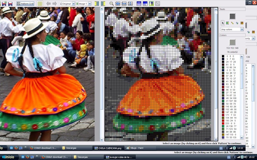 Esta aplicación nos permite que a partir de cualquier imagen poder crear un patrón de punto cruz. Como ustedes pueden ver en la imagen, he convertido la foto de una chola cuencana en un patron en punto cruz.