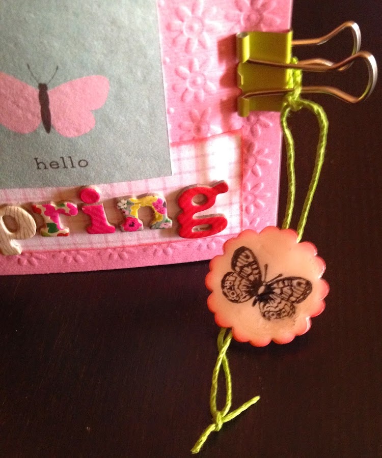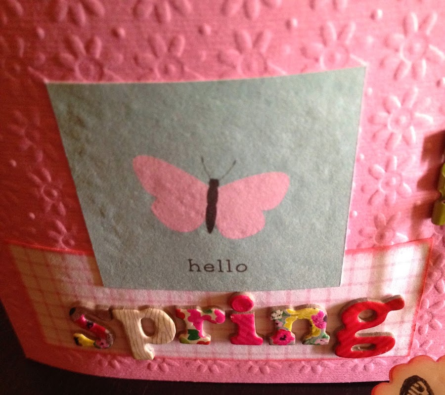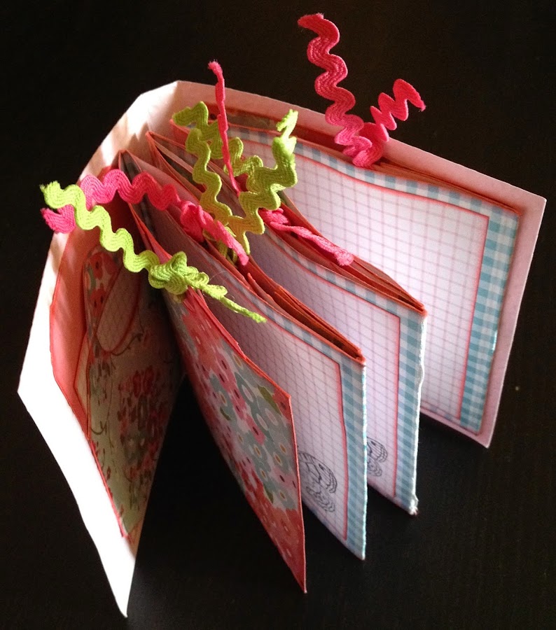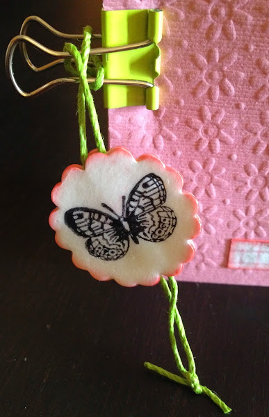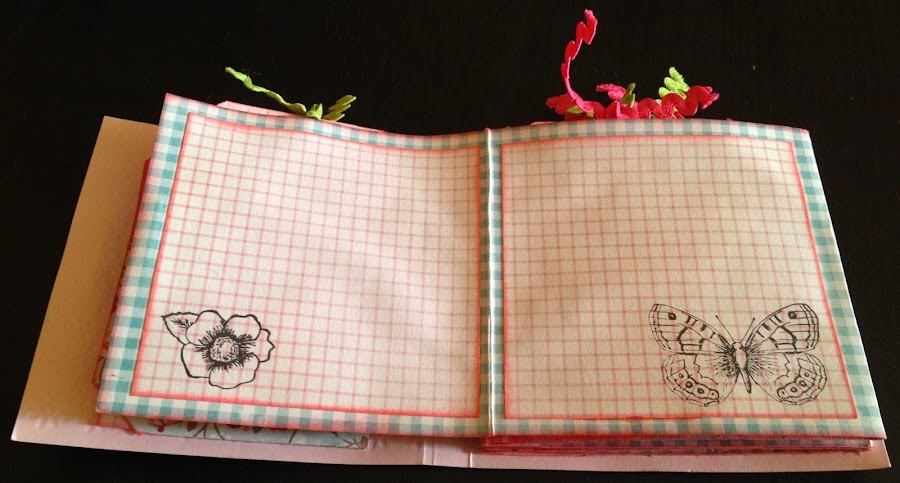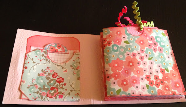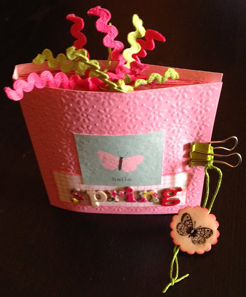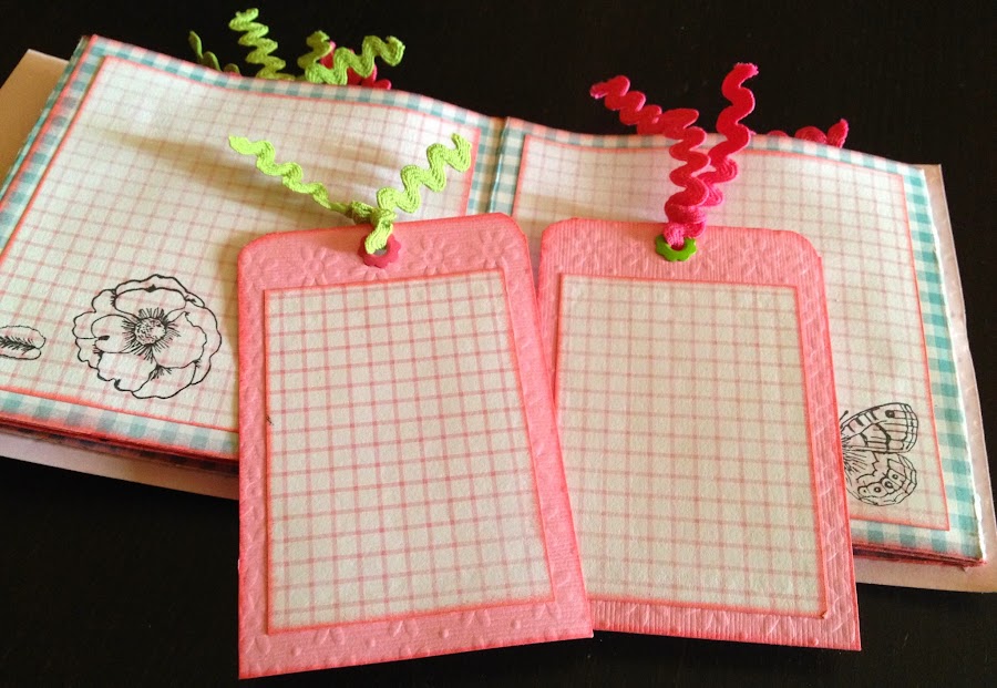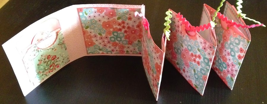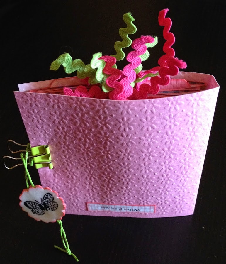El mini album que le hice en acordeón, le hice bolsillos para poner tags y todos los bordes con tinta distress en rosa y se cerraba con una pinza.
