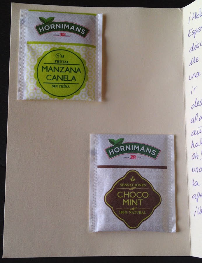 Y yo lo que he recibido, que me pidio perdon por el retraso y que esta muy liada y que no ha podido hacer mucho, pero a mi me gusto mucho. Un punto de libro, una tarjeta con una estampación muy chula y una chapa forrada de tela de cerezas y fresas y dos sobres de variedad de té.