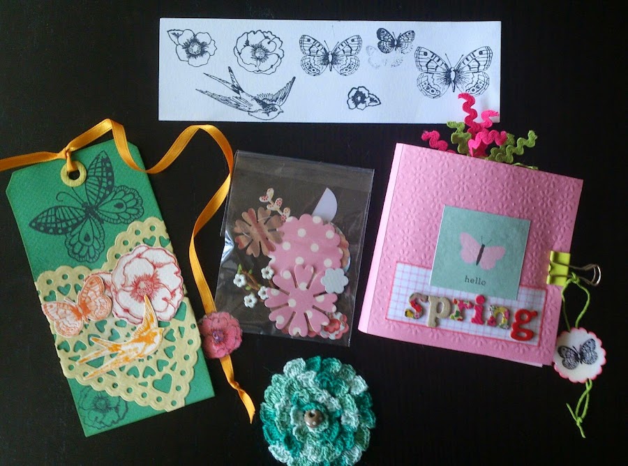 Yo a la persona que me tocó le envie un punto de libro, un mini album acordeon, un broche de flor echo de crochet, sellos estampados y muchas chuches scraperas. Todo lo que hice esta relacionado con la primavera.