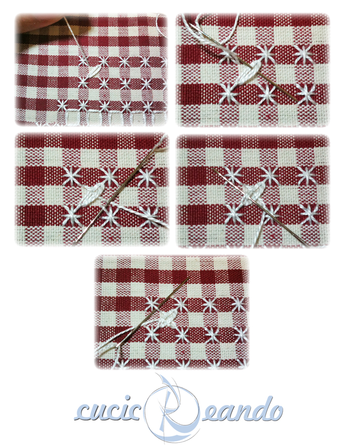 Si parte sbucando, come sempre, sul dritto del lavoro nell"angolo in alto a destra del punto croce doppio. Muovendoci in diagonale facciamo passare l"ago sotto la barretta, come nella seconda foto, e poi facciaom il secondo passaggio passando sempre sotto le barrette per poi chiudere andando sul rovescio del lavoro vicino a dove eravamo sbucate all"inizio.