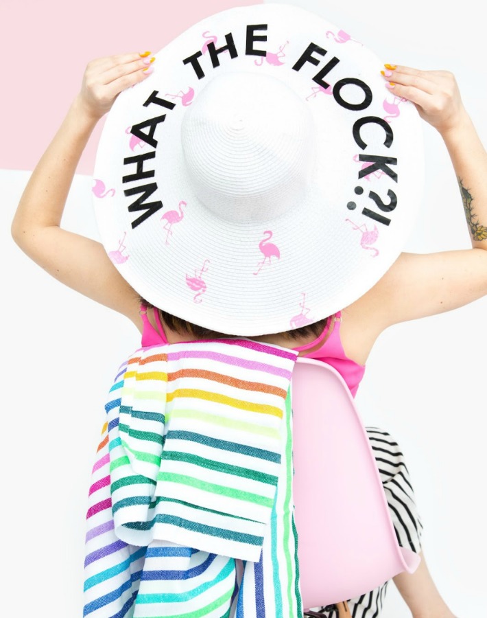 Cambiamos de material y técnica, ahora tuneamos una pamela con vinilos tanto de letras como de dibujos...¿Te has dado cuenta que además de la frase a incluido unos pequeños flamencos? La idea es de Aww sam