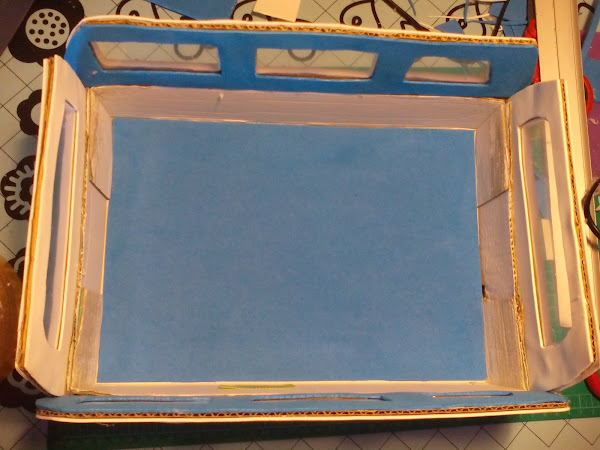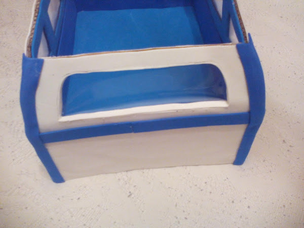5. Usaremos una caja de zapatos como base para nuestra furgoneta contenedor. Forraremos con goma eva azul.