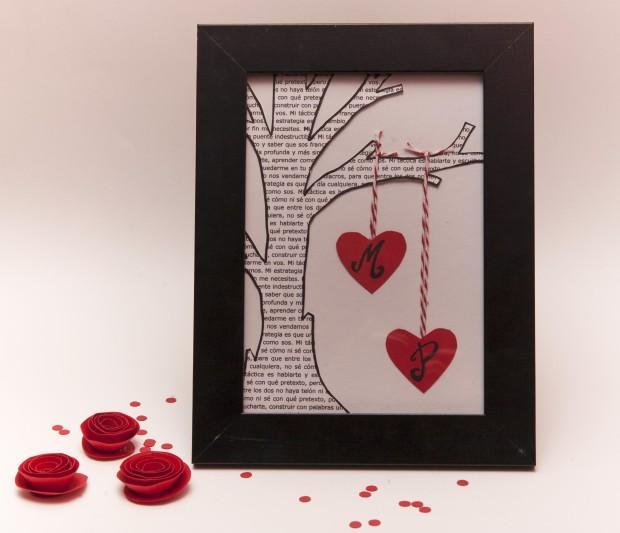 Un regalo ideal que tu mismo puedes hacer , necesitas papel periódico, un marco ya sea nuevo o si deseas reciclar alguno que tengas guardado , papel construcción rojo, cordón , goma y tijeras , con la plantilla vas a recortar los corazones y el árbol , para luego pegarlos en el marco ; puedes encontrar todo para realizar tu proyecto en por cuatro cuartos