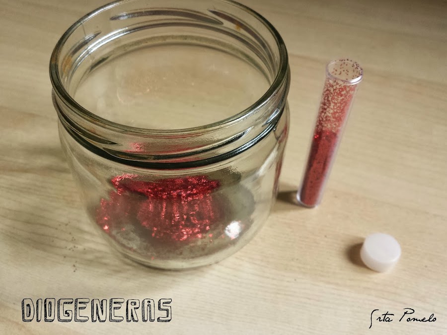 Echamos brillantina dentro del bote y lo llenamos de agua casi al ras del borde.