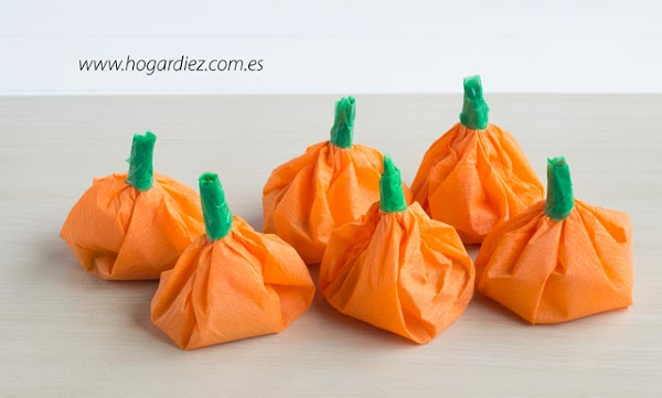 Aquí otro de los posts de mi blog, que puedes hacer en un momento y el resultado es algo más que aceptable para repartir caramelos entre los niños. En esta ocasión los materiales que vas a necesitar son: papel de crespón color naranja, cinta verde adhesiva, tijeras, lápiz y caramelos o gominolas. Puedes ver el proceso completo para realizar estos dulceros haciendo clic sobre el título.