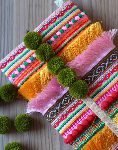 En el blog Honestly WFT nos enseñan a realizar este bolso de mano de estilo boho utilizando un bolso antiguo de rafia y forrándolo de pasamanerías de colores y pompones......¿Bonito verdad?