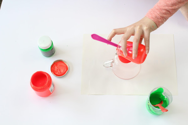 2 Paso: Mezclamos los colores con barniz vitrificable en botes de plástico. Hay que tener en cuenta de mezclar a partes iguales, podemos ayudarnos con unas cucharas para tener en cuenta las medidas.