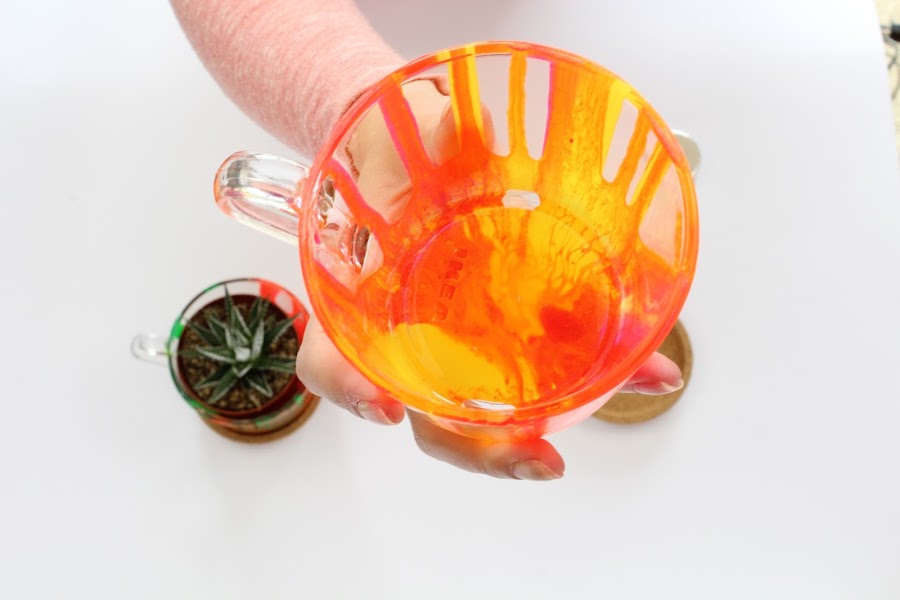 4 Paso: Una vez tengamos la mezcla preparada, echaremos el primer color encima de la taza. Dejamos secar una media hora para evitar que se mezclen los colores.