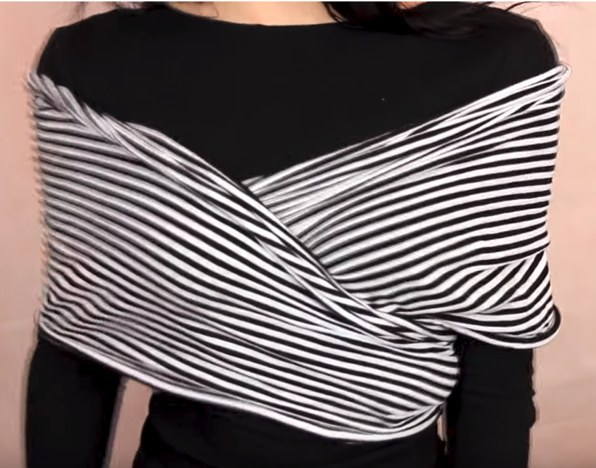 Coloca el chal en tu espalda, debajo de tus brazos y en horizontal. Llévalo hacia delante, cubre el pecho y haz un nudo en el centro. Introduce cada extremo sobrante en cada lado, para ocultarlos, ¡y terminado!Modelo 5