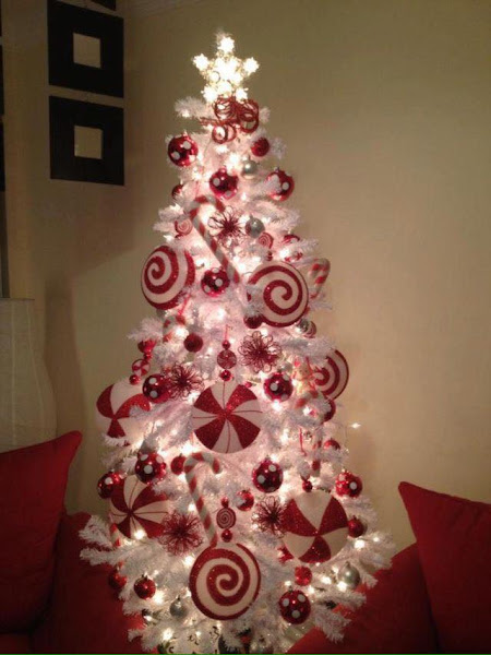 Usa esferas navideñas de color rojo y plata , haz bastones y decora tu arbolito blanco de navidad.