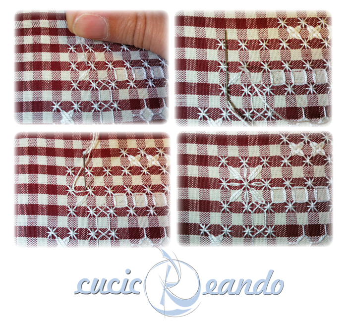 Per gli altri petali però non facciamo il doppio passaggio, come potete vedere, ma dopo essere tornate sul dritto del lavoro passiamo una sola volta sotto la barretta del punto croce doppio vicimo e poi chiudiamo subito il petalo tornando sul retro del lavoro. Ripetiamo le stesse operazioni per tutti i petali del fiore singolo e poi lo ricamiamoanche negli altri angoli del nostro progetto.