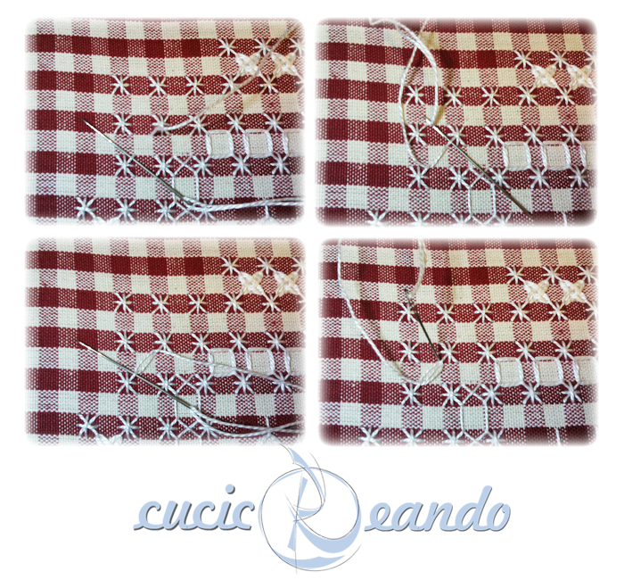 Bene, iniziamo con fare i punto croce doppio che ci servono e sbuchiamo sul dritto del lavoro come vedete nella terza foto.