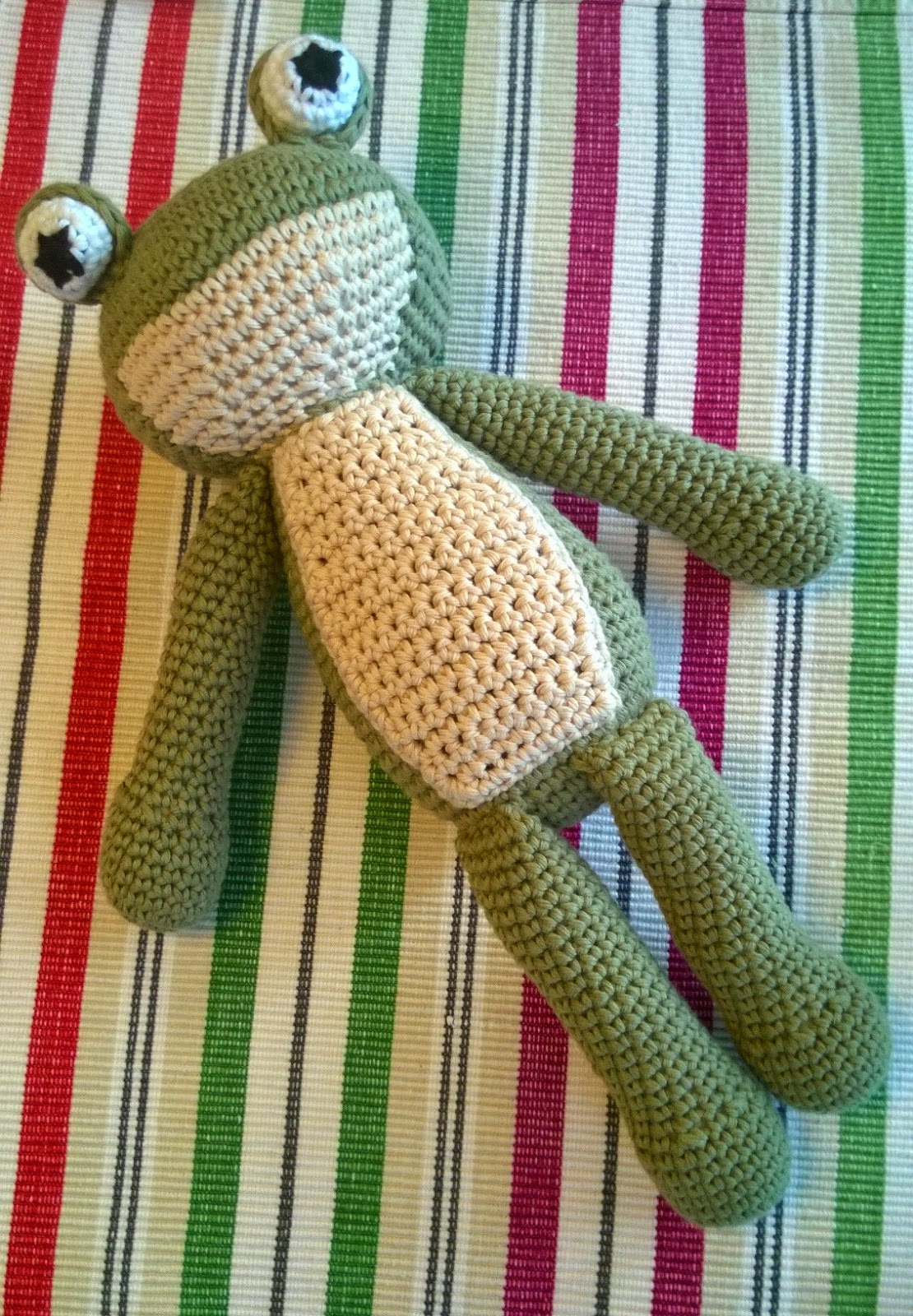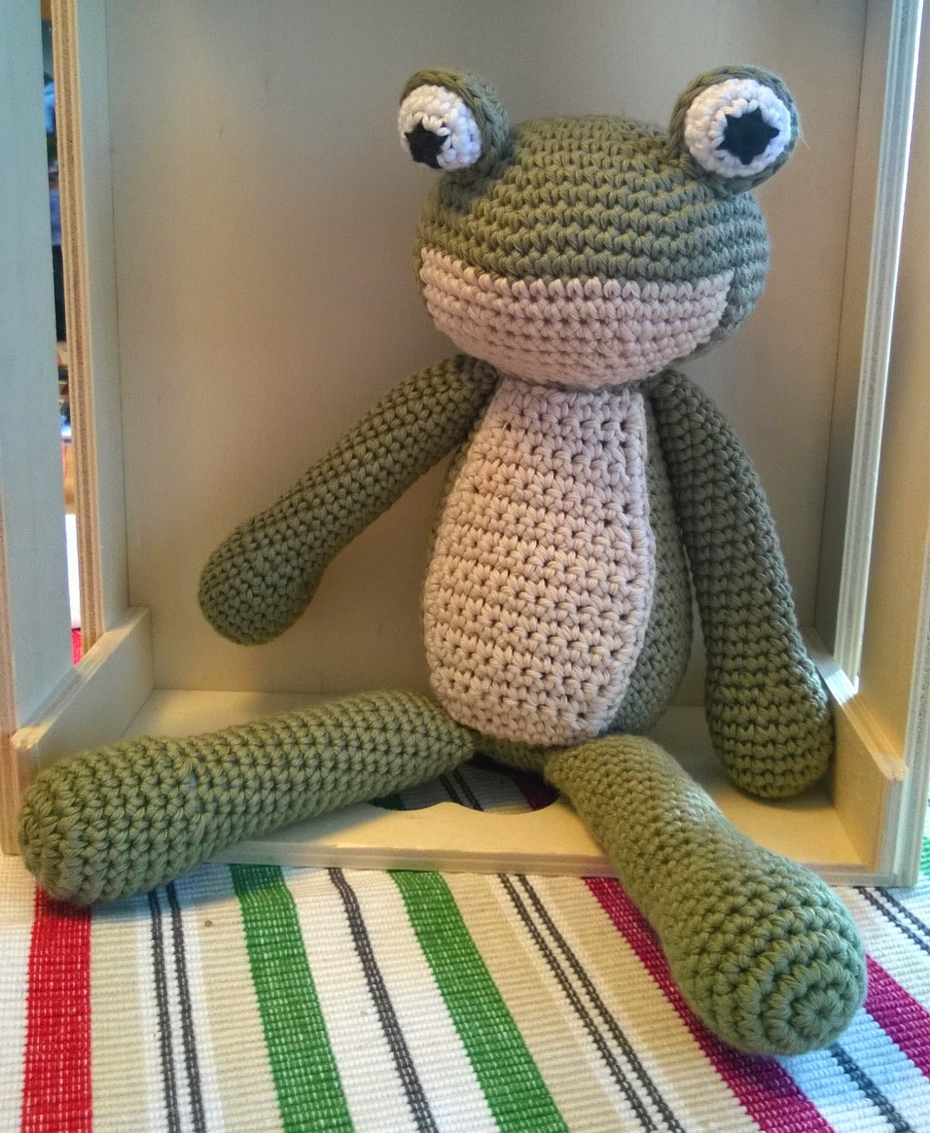 Mi última creación ha sido esta rana, está tejida con ganchillo de 3.5mm y mide 32 cm de alto.