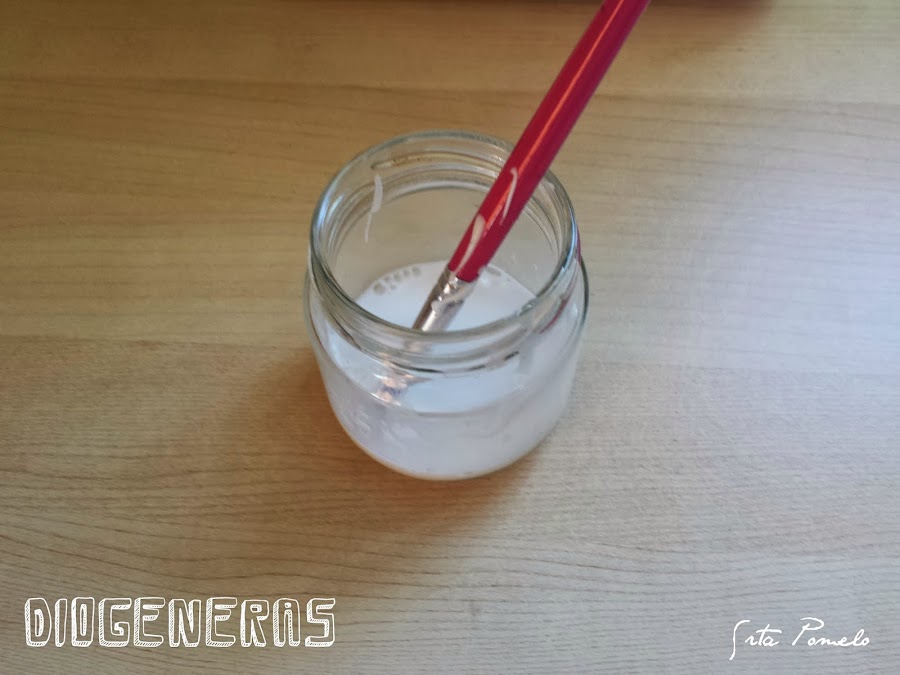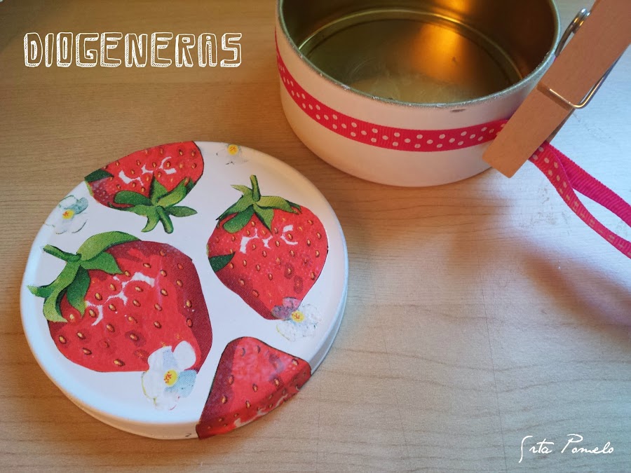 He preparado un mejunje a base de cola blanca y agua a partes iguales, poca cantidad, ya que no voy a necesitar mucha. He impregando las fresas por su parte posterior y las he ido pegando en la tapa con mucho cuidado de que no se rompan. Después le he dado una nueva capa encima de mejunje para asegurarme de que se pegan bien.