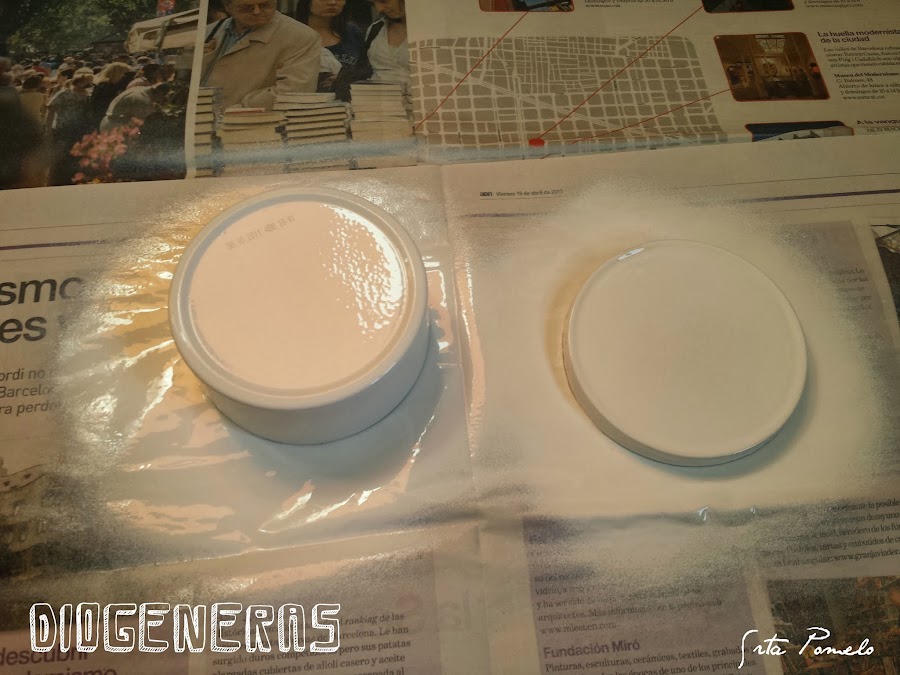 Lo primero que he hecho es proteger el suelo con papel de periódico y ventilar la habitación. He pintado con pintura blanca en spray la parte de abajo de la lata y la tapa (por dentro no la he pintado). La he dejado secar muy bien.