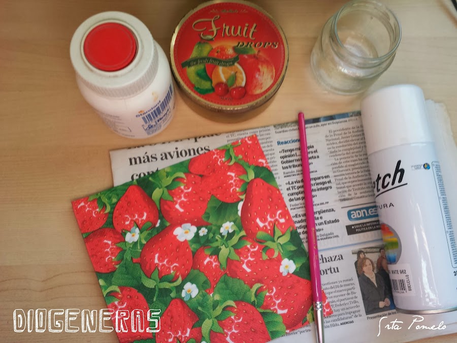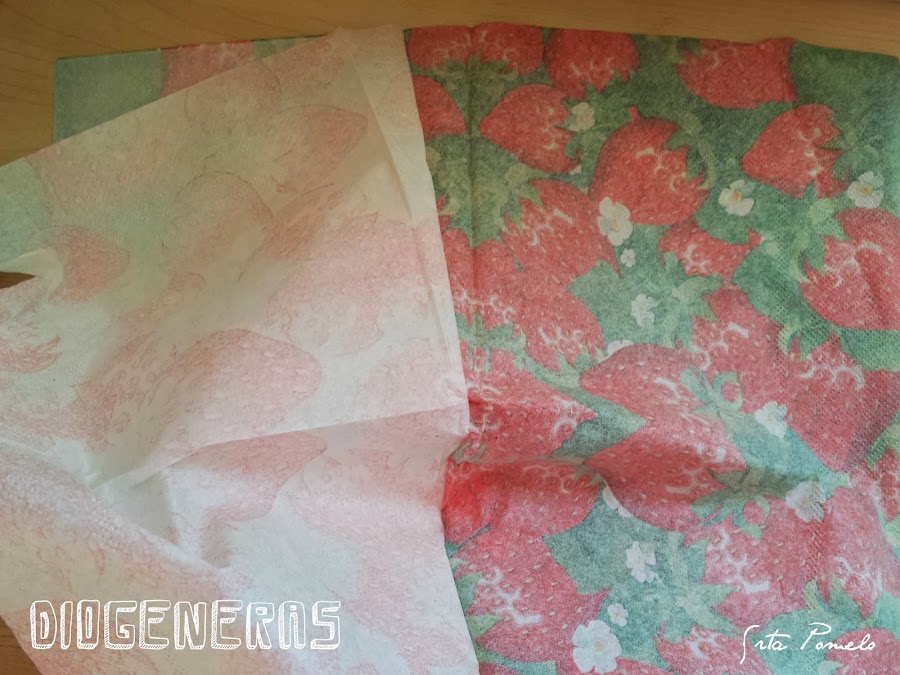 He cogido una servilleta estampada con fresas y he separado las dos capas. Me he quedado con la que tiene el estampado y he recortado algunas fresas.