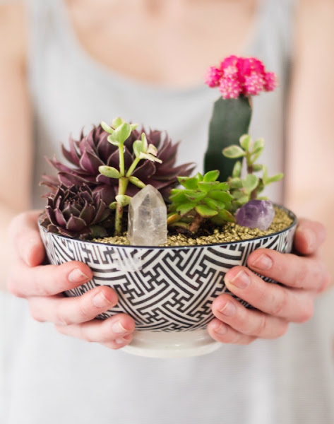 La primera idea para regalar el día de la madre es un centro de cactus y suculentas que puedes crear utilizando un cuenco de porcelana bonito que no uses. Primero tienes que poner una base de piedras, para después colocar la tierra y una selección de cactus y suculentas, para finalizar colocas piedrecillas diminutas. Todo el proceso bien detallado lo tienes en the blondielocks