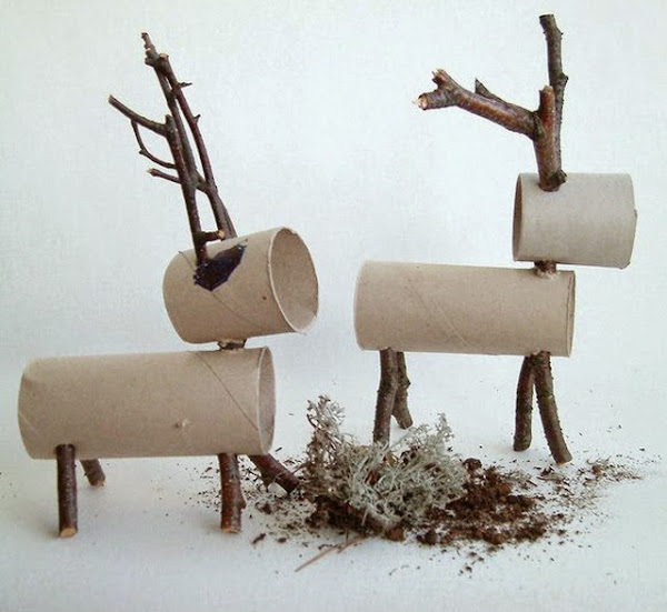 Unas ramas y unos tubos de cuando se acaba el papel higiénico y tendréis estos renos tan graciosos.