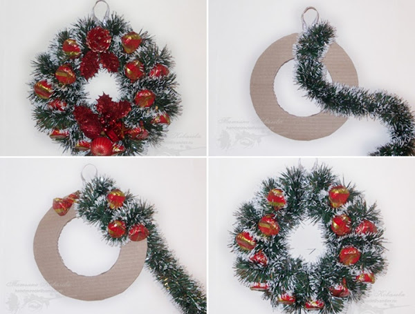 1. Para nuestra primer corona, usaremos un aro de cartón y una guirnalda de esa que encontráis en cualquier casa de decoración de navidad. También algunos adornos y chirimbolos.