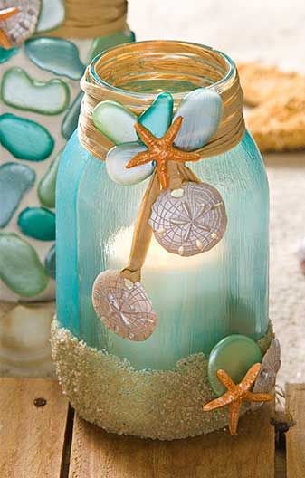 Pinta tu frasco en verde mar y decorarlo con motivos playeros, ideal para decorar una casa en la playa.