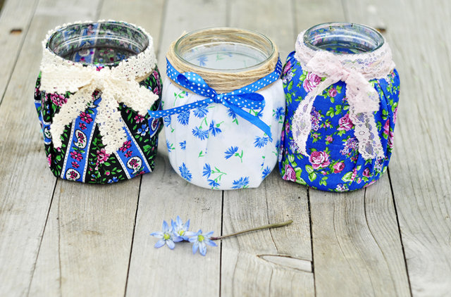 Puedes usar esos retazos de tela que tienes guardados para forrar tus frascos y decorarlos con encaje.
