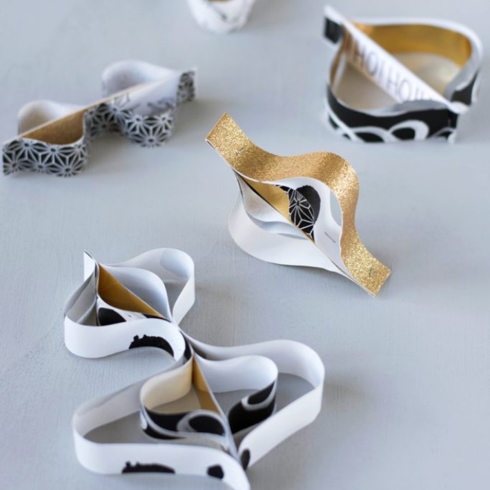 Para crear estos bonitos adornos para el Árbol de Navidad tan solo necesitamos unas tiras de papeles dorados, estampados.........y con ellos hacer unos adornos tan bonitos como los que comparte Sinnenrausch