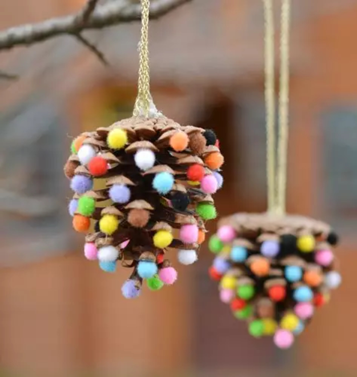 Ojo a este adorno: muy muy fácil, pero resultón. Coge piñas y, con la ayuda de una pistola de silicona, pégales mini-pompones de colores que puedes comprar en cualquier tienda de manualidades. Una cadenita para colgarlas o una cuerda, depende del acabado que quieras y perfectas para tu árbol de Navidad.