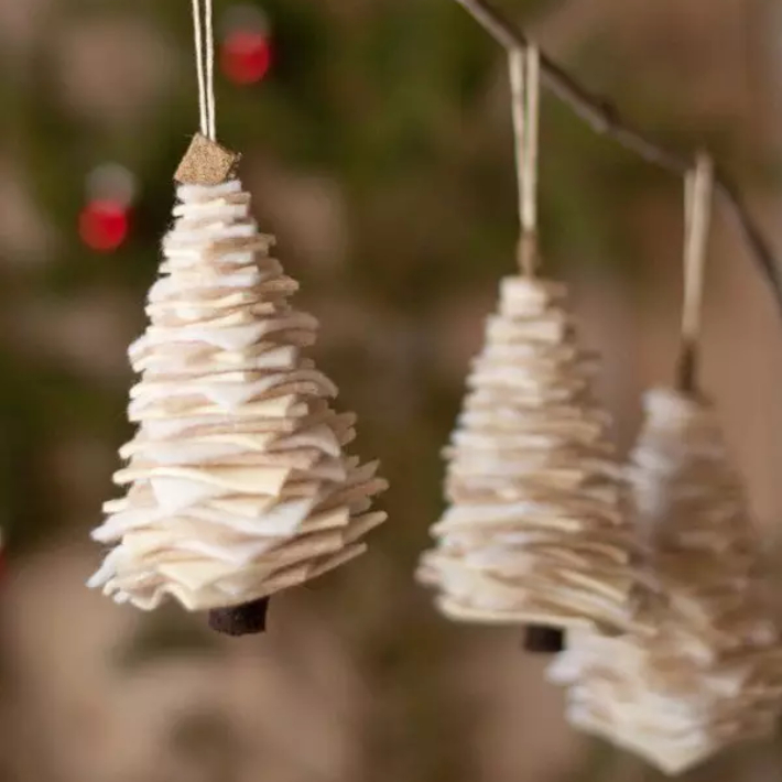 Más árboles de Navidad en miniatura para colgar. En este caso, están hechos con diferentes trocitos de fieltro, puestos encima unos de otros. Los tonos blancos que han elegido para hacerlos les dan un toque navideño genial.