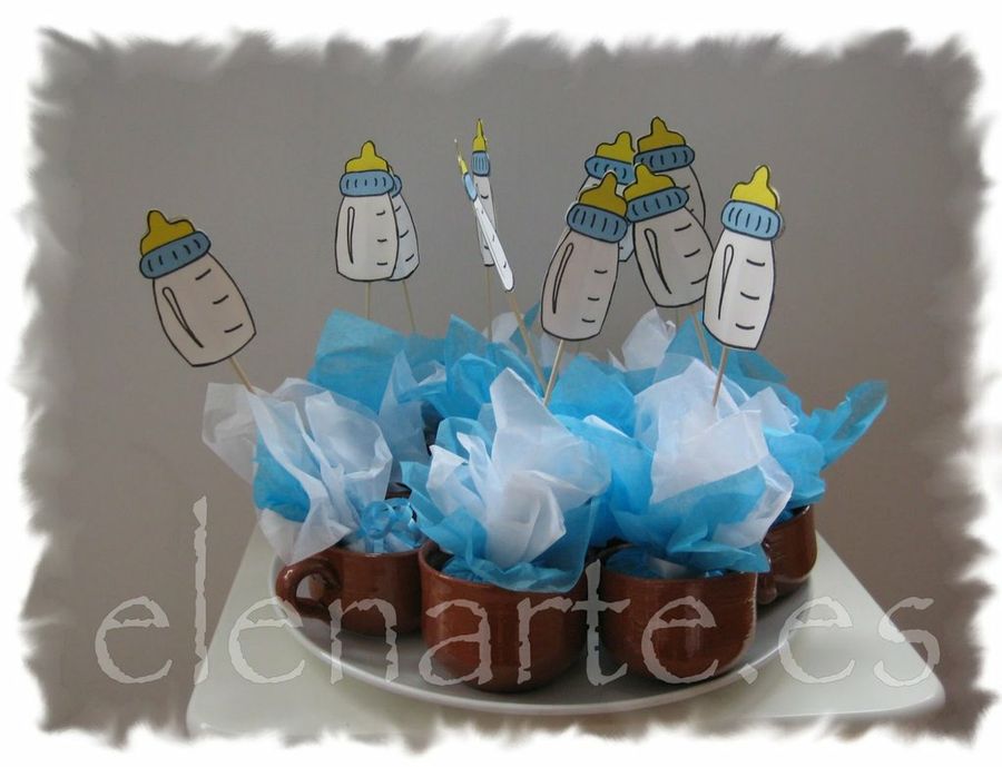 3 En Elenarte vemos un bonito detalle con el que sorprender a las asistentes. Como veis, se trata de pequeñas tazas que están rellenas de dulces envueltos en papel pinocho, y decoradas con uno de los principales motivos de este tipo de celebraciones, los biberones.