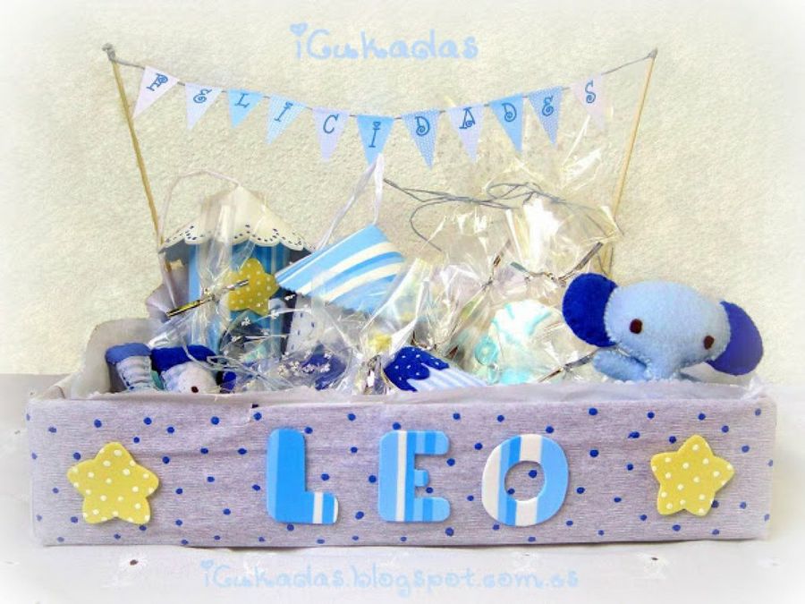 7 A esta caja de Icukadas no le falta ningún detalle: Unas lindas casitas para pájaros para decorar, galletas personalizadas, un trenecido de tela personalizado, un colgador para chupetes.. Así, podemos reutilizar, por ejemplo, una caja de madera de la fruta, que podemos forrar o decorar y rellenar a nuestro antojo.