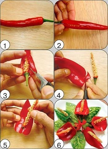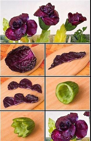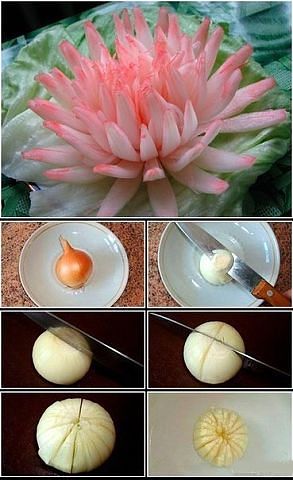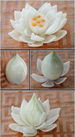 Ya veras lo entretenido que puede ser, hacer este tipo de flores usando cebollas, pepinos y otras verduras, te dejo las imágenes del paso a paso de cómo se van armando este tipo de flores, como el alcatraz rojo, flores de loto y mucho más...