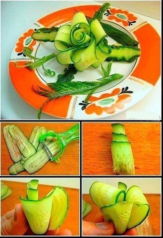 Con un pelador bien afilado y chico corta finas laminas de pepino y enrolladlos en forma espiral, este sera el centro de la flor, luego haz los pétalos, solo tienes que doblar por la mitad las laminas, puedes usar unos palillos para sostenerlos, córtalos y mételos.