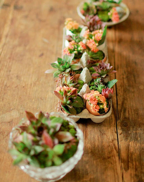 Podemos reciclar las hueveras de cartón para utilizarlas como centro de mesa. Pero no solo las hueveras, las cáscaras de los huevos nos servirán como mini tiestos en los que plantas pequeñas suculentas ¿Qué os parece la idea?