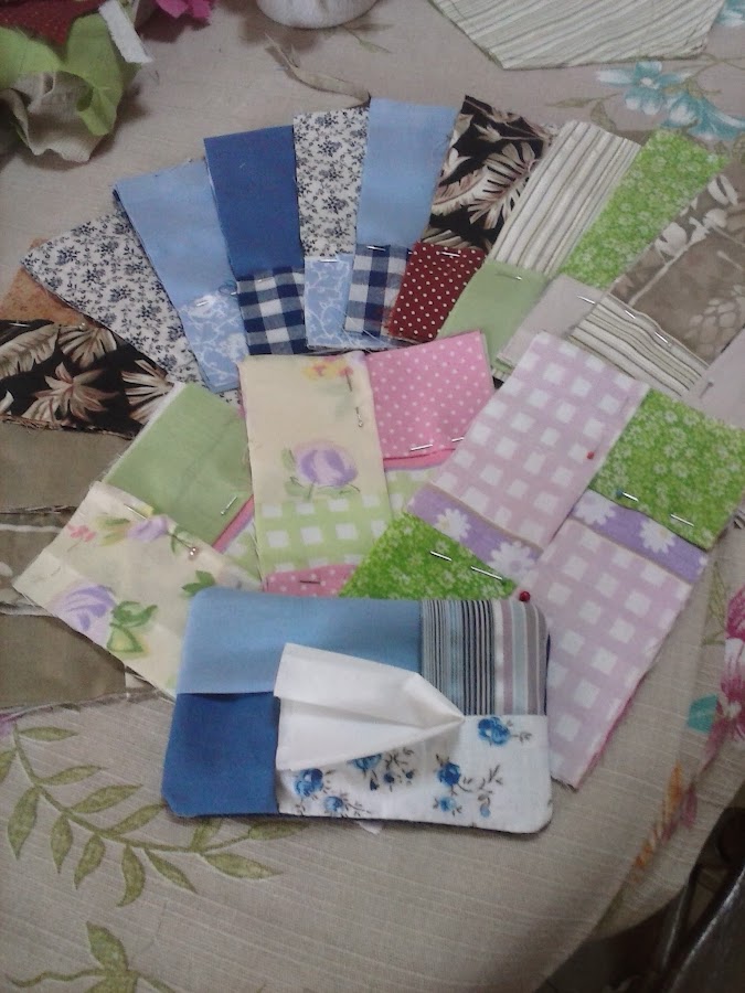Hay dias en que amanezco sin muchos ánimos y una forma de motivarme es sacar mis retazos asi que estos dias en que el dolor de mi pie y la dificultad para caminar me pone plof, busque un tutorial (http://alicias-hiding-place.blogspot.com/2012/04/estuche-para-panuelos-desechables-porta.html) en internet que hay varios, para hacer fundas para pañuelos desechables... asi que unos retacitos unas puntadas y ya tengo preparados varios obsequios para dia del Cariño