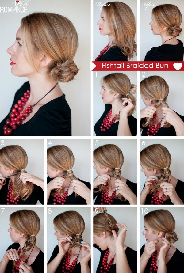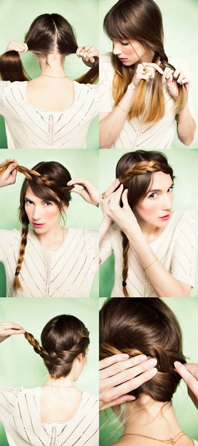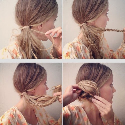 4. No necesita explicación, consiste en hacer varias trenzas, una finitas desde la raíz, y otras más gruesas una vez hecha la coleta, después enrollar para formar el moño.