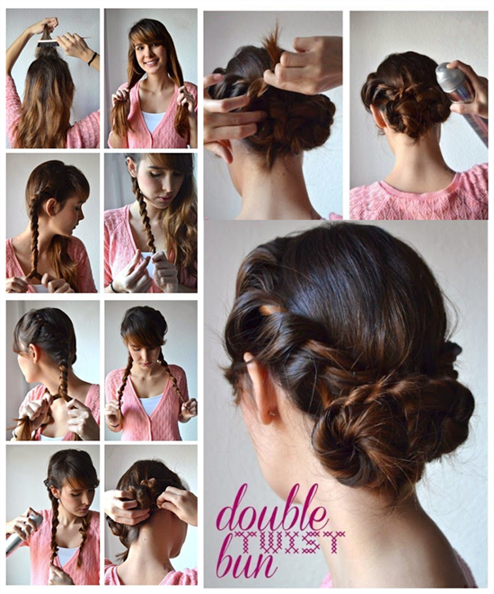 1. Este es sobretodo para cabello medio-largo. Consiste en dividir el pelo en dos secciones y hacer en cada una una trenza. Para terminar recoger las dos trenzas en la nuca fijándolas con horquillas.