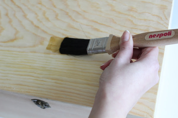 1 PASO: Teñiremos la madera con un tinte al agua de esta forma resaltaremos el veteado de la madera, yo he usado el color castaño de la marca Xylazel. Es una forma rápida y sencilla de proteger la madera y darle un acabado muy sofisticado.