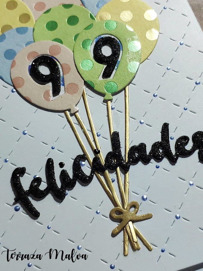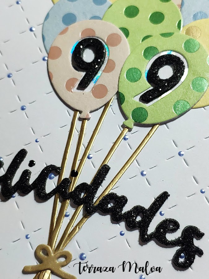 Los globos son troqueles de Spellbinders en cartulinas con estampado de topos en foil de DCWV.