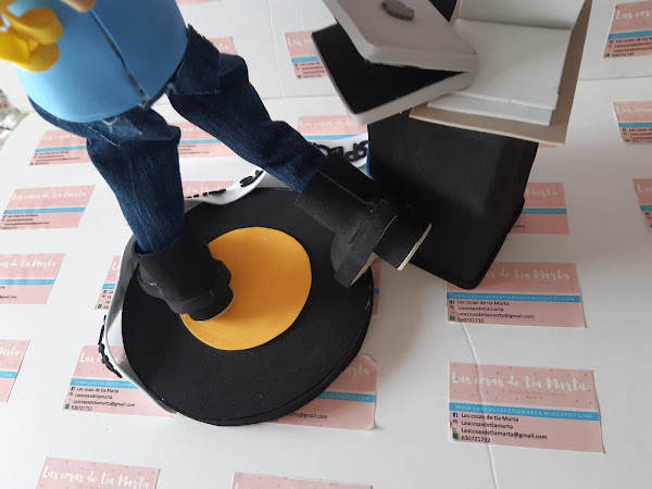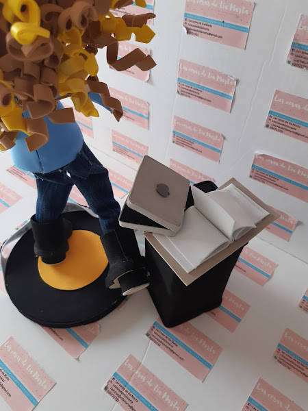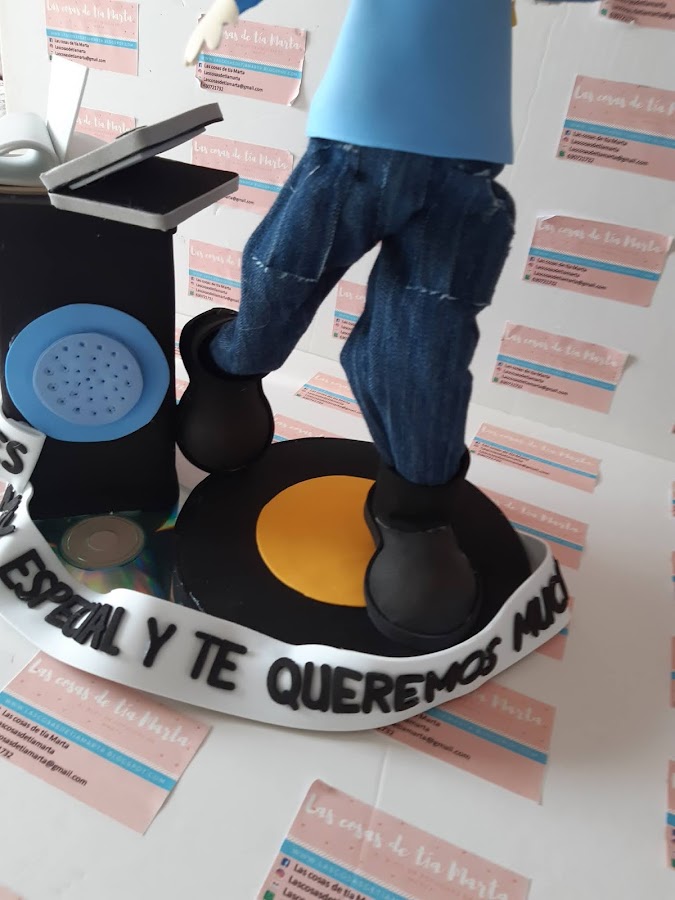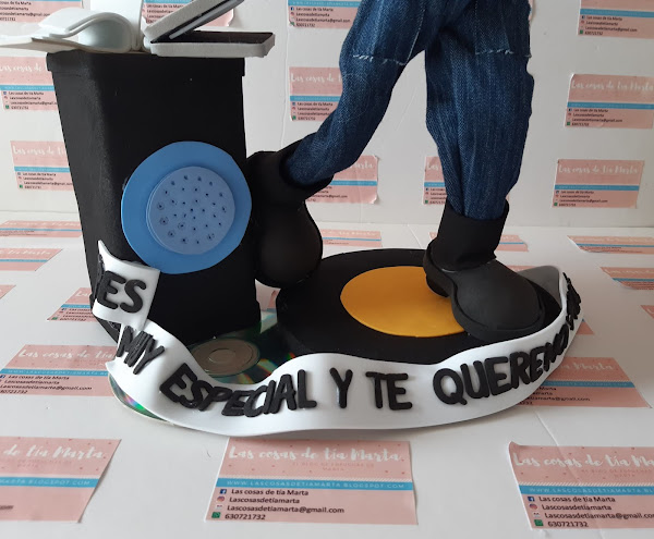 Camiseta con hombros al aire, pantalón, pelo castaño y con mechas rubias. En la base un CD de música, un disco de vinilo, altavoces, libro y ordenador para no olvidar su trabajo.