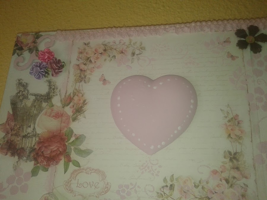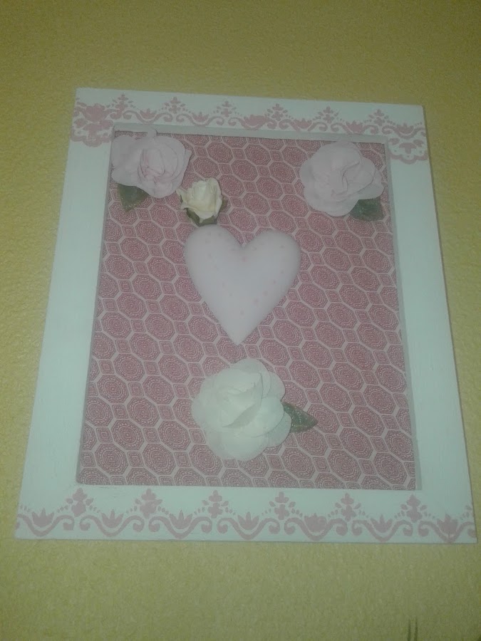 Este último solo hice esta foto pero veis como lo realice, tela en el fondo, estensil, flores de tela otra de goma eva y un corazón también de yeso, el marco es reutilizado , lo pinté en blanco.