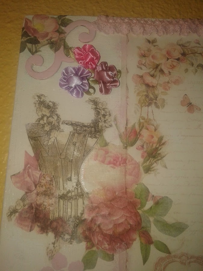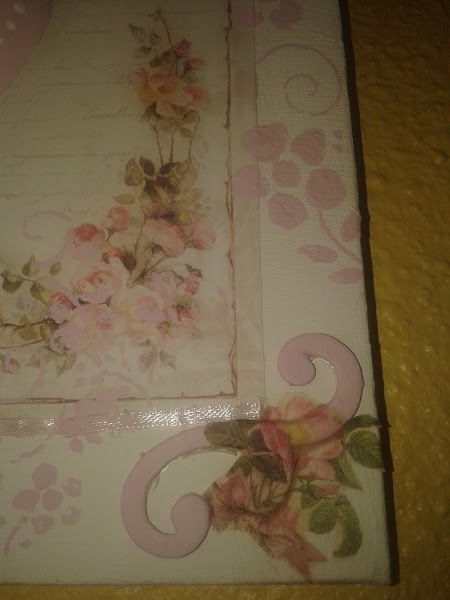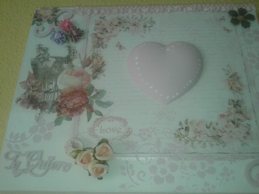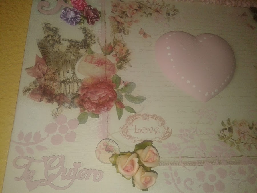 Lo realice en un lienzo que tenia pintado, le aplique tres capas de pintura blanca, un estensil de flores , hice el transfer del corsé, unos chars, flores cartulina de skraf, y un letrerito de "te quiero", decoupaje y puntillas.