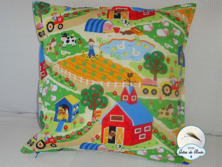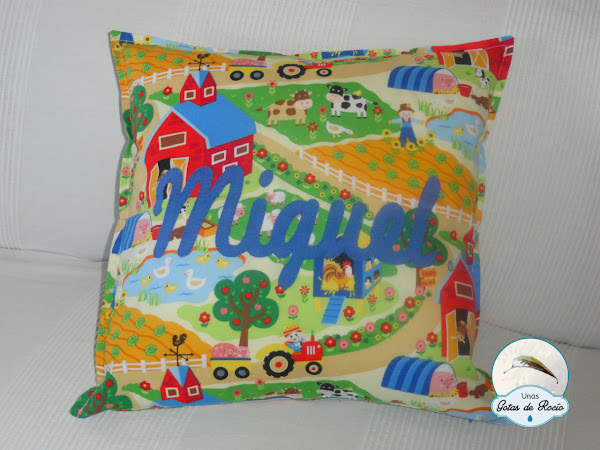 De este conjunto hoy os enseño un cojín. La tela elegida es super alegre y el nombre destaca con facilidad, que nadie se equivoque de cojín!!!!
