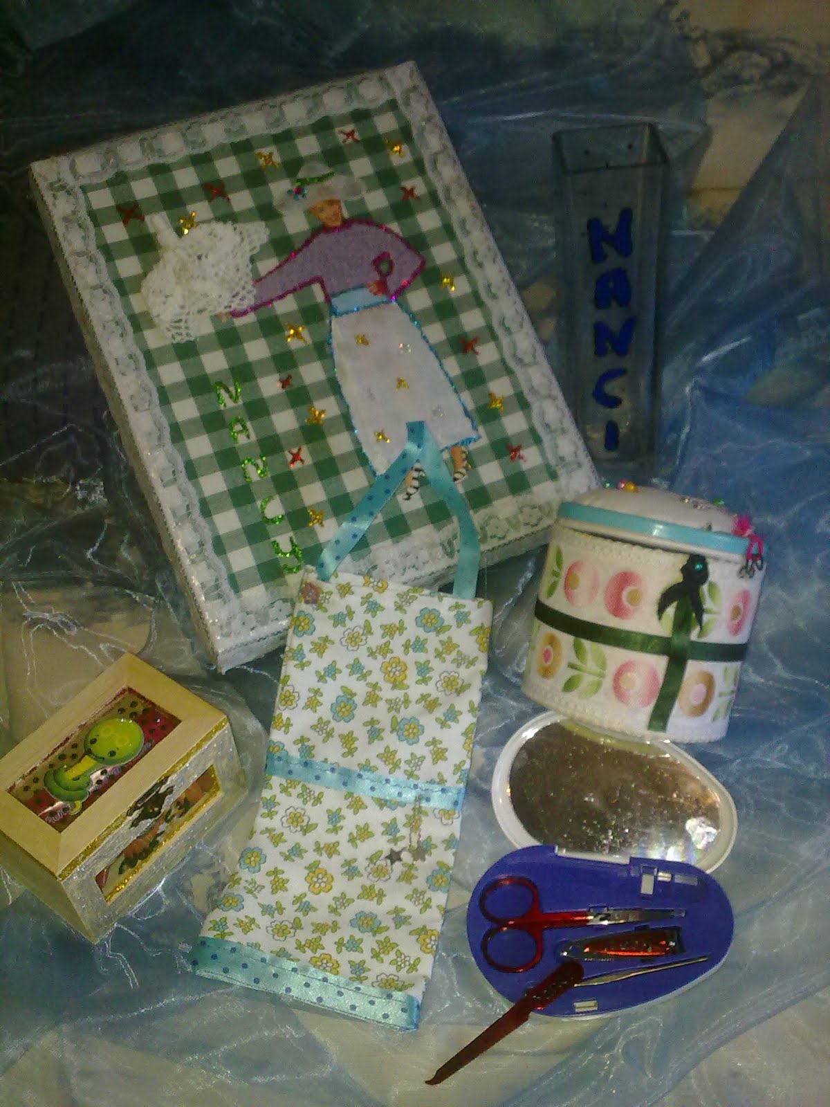 Estos son los regalos de mis compis del trabajo: una caja decorada modelo Sta. Pepins versión Hanna Montana, una caijta decorada de madera con chuches, un florero personalizado, un costurero para la taquilla, un estuche de manicura personalizado para la taquilla y una bolsita que todas tenemos en nuestra puerta para guardar las tijeras.....