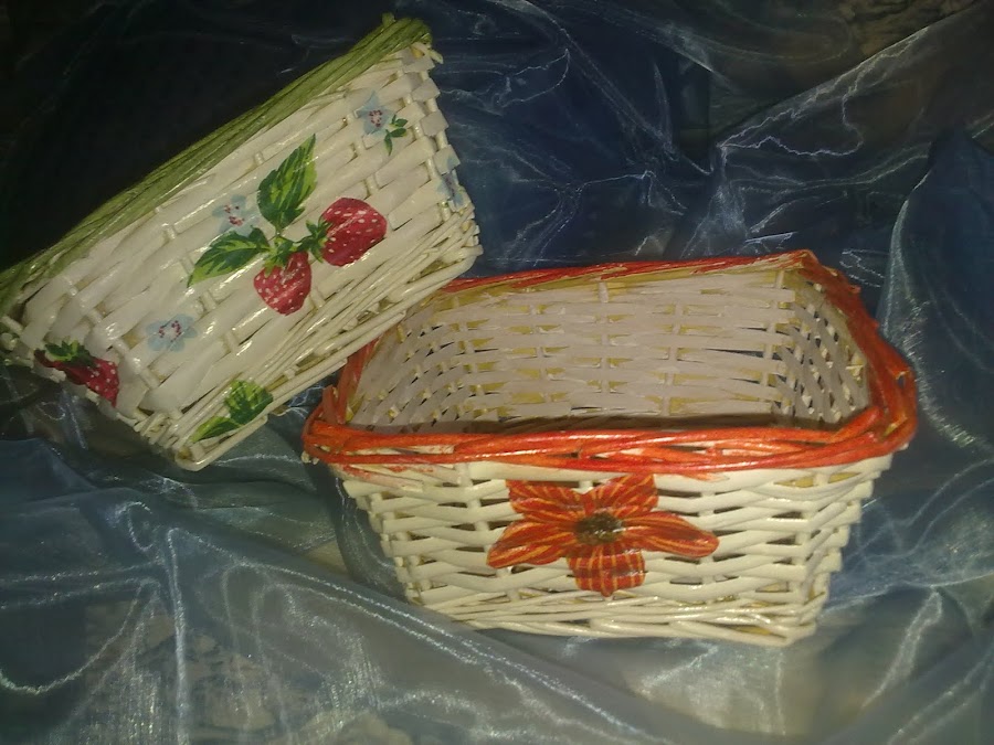 Para abrir boca, y nunca mejor dicho, un par de cestitas de mimbre decoradas con decoupage para endulzar nuestros momentos de labores ya que mientras trabajamos siempre nos gusta tener chuches y pastelitos para acompañar al café
