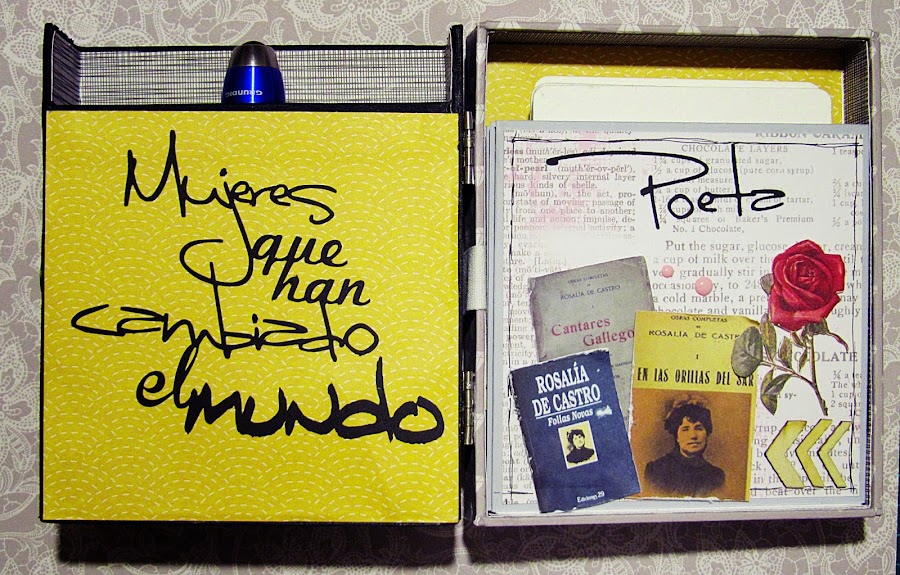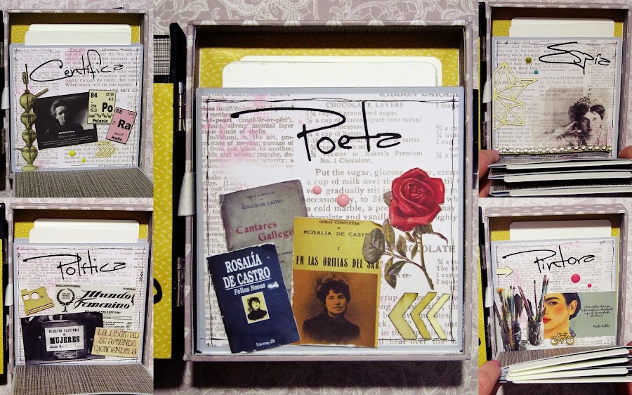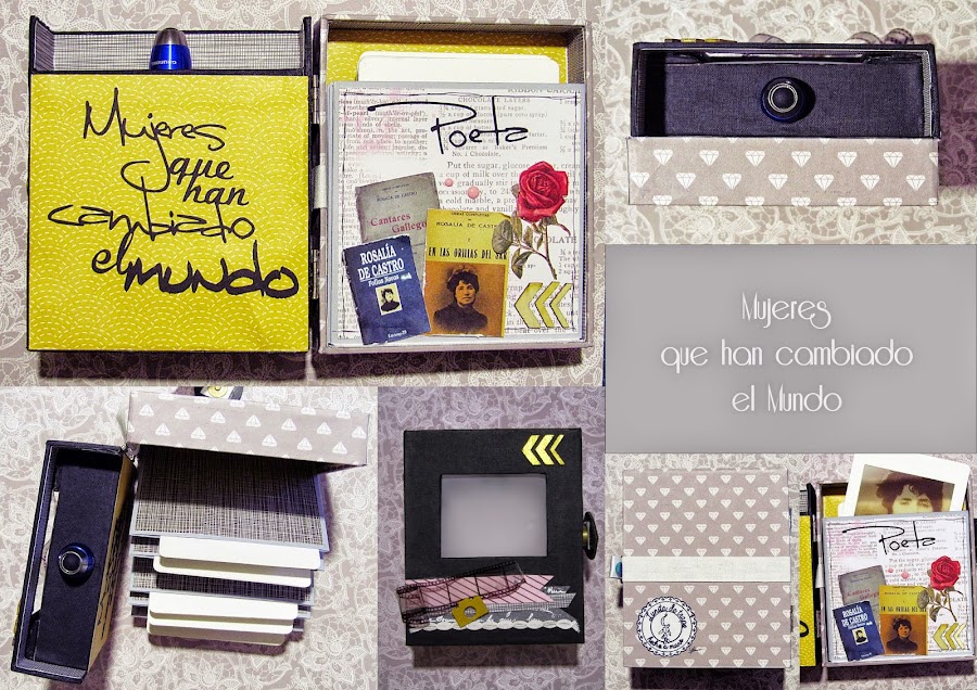 Y esta es mi interpretación como DT, mini-álbum caja de luz, y el título "Mujeres que han cambiado el mundo por su profesión", lo que he querido hacer es una caja de luz donde poder ver las fotografías en forma de diapositiva de las 5 mujeres que he escogido para hacer este mini, sin más os dejo con las fotografías y un pequeño vídeo para que podáis ver cómo funciona.