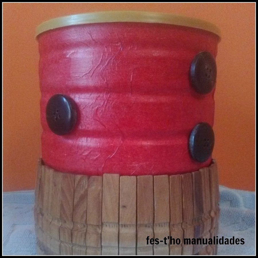 Como parece que no tuve suficiente, aun me puse con la segunda con la esperanza de que se me diera mejor. No quise malgastar las bonitas servilletas de antes y aproveche unas rojas, lisas, que tenía por casa. La cosa fue peor, puede que por los nervios, y al secar vi que tenía un montón de rotos por todas partes. Para "disimular" la tuneé un poco, con unas pinzas y unos botones. Si, ya se, un poco recargada y sosa...