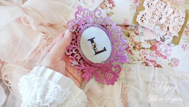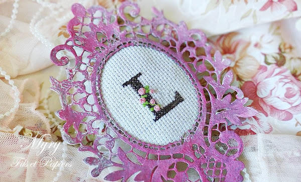 I painted it with acrylic pink and white paint. I embroidered a letter with small flowers,