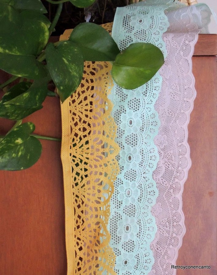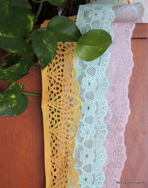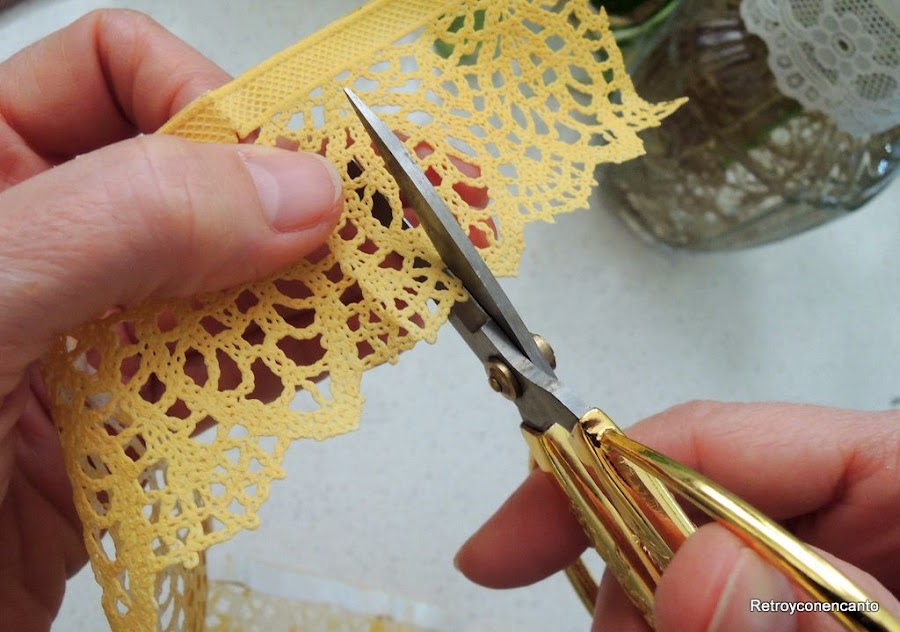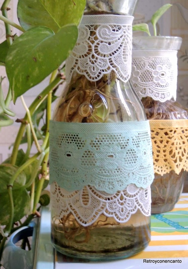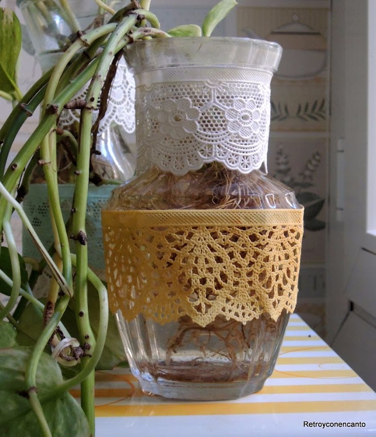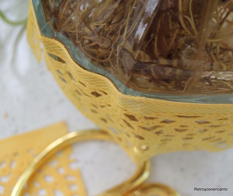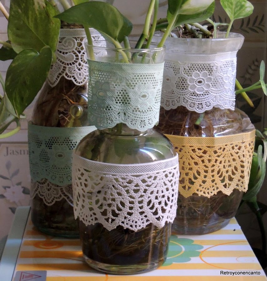 Visto lo visto, nos hemos puesto a decorar más recipientes que teníamos por el taller. De nuevo, puntillas de plástico pintadas en diferentes colores.