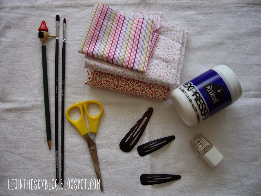 Materiales: Retales pequeños de tela, horquillas de clip, cola blanca para manualidades, tijeras, bisturí (esto no está en la foto porque me dí cuenta después de que lo necesitaba), pincel y laca de uñas transparente.